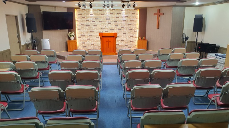 5층 빌딩 4층에 위치한 상가 교회입니다.